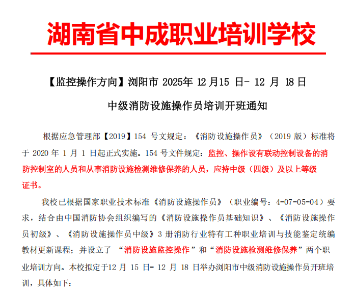 2025年 12 月湖南省浏阳校区消防设施操作员培训班将于12月15~18日开班(文后附最新岗位需求,推荐上岗)