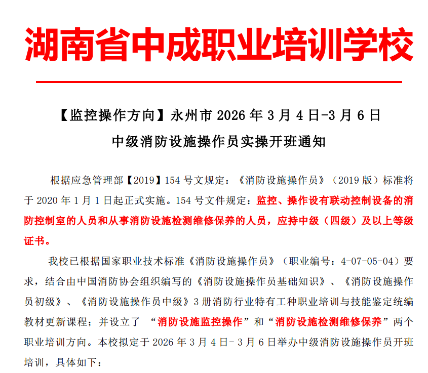 2026年3月湖南永州市消防设施操作员培训班将于3月4日~6日开班(年后超多岗位需求,推荐上岗)