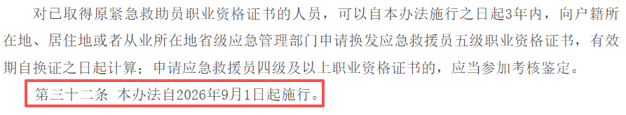 近日,随着《应急救援员职业资格管理办法(试行)》(以下简称《新办法》)征求意见稿的结束,应急管理部会同人力资源社会保障部正式印发该文件,明确 《新办法》自2026年9月1日起施行 。